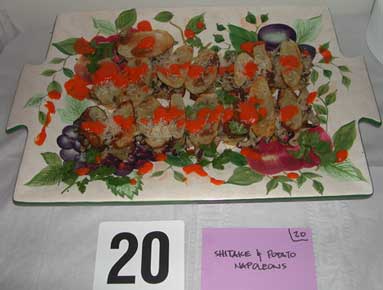 Code Dish Chef Average 26 Crispy Shitake Mushroom Noodle Pancake Ian and Clara Krememic 17.857 25 Shitake Mushroom Ravioli Kat and Chris Polk 16.353 20 Shitake and Potato Napoleons Joe Denivo 16.250 24 Chocolate Raspberry Shitake Petit-Fours Dave Kemp 16.050 13 Two Fillings - Shitake Fried Dumplings David J. Cavuto 15.813 18 Shitake and Ricotta Patties with Tomato Sauce Scot Raff 15.571 15 Shitake Bruschetta Ray & Jason 15.278 23 Mushroom Moussed Mushrooms Jeremy & Cappy 15.077 16 Hot n' Sour Soup Scot Raff 14.733 19 Exotic Mushroom Bread Pudding with Sweet Red Pepper Sauce Joe Denivo 14.353 27 Homestyle Biscuits with Shitake Mushroom Gravy Ian and Clara Krememic 14.333 21 Shitake and Wild Mushroom Strudel with Cognac Cream Reduction Kat and Chris 14.176 14 Mushroom Medley Pie with Sauce Lea Popielinski 14.000 17 Wild Mushroom Polenta Josiah Hobson 13.500 10 Shitake Bread Pudding Chris Call 13.353 12 Shitake and Homemade Polenta au Gratin Marah Cavuto 13.294 11 Pasta with Blue Cheese and Shitake Mushrooms Jon and Lisa 12.000 22 Spring Stew Jen Fogle 11.071